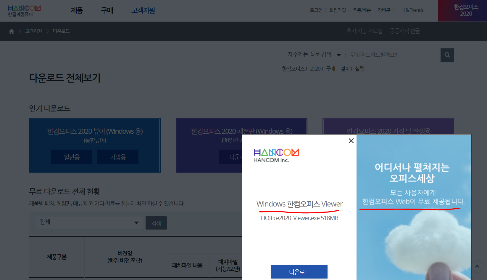 먼저 한컴에서 제공하는 문서 뷰어 프로그램을 다운로드해 보겠습니다. 한글과 컴퓨터 사이트에 들어가서 왼쪽 하단의 다운로드 센터를 클릭하면 윈도용 한컴오피스 2020 뷰어를 무료 다운로드할 수 있습니다. 자신의 PC에 일반용 뷰어 프로그램을 저장하고 설치하면 hwp 한글문서를 읽는데 전혀 문제없습니다.